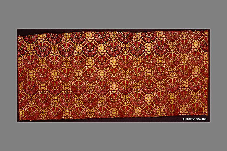 The repeating pattern of stylized flowers arranged in a fan shape within an arch in red and gold on a shaded green ground reflects Christopher Dresser's interest in Japanese textiles, while it also fulfills his requirements for good textile design. Dresser argued that textiles, unlike pictorial art, were only suited for flat, ornamental design. As he elaborates in Principles of Decorative Design (1873), "The ornamentist when enriching a fabric deals only with a surface, and has no thought of placing pictures thereon; he has simply to enrich or beautify that which without his art would be plain and unornamental."