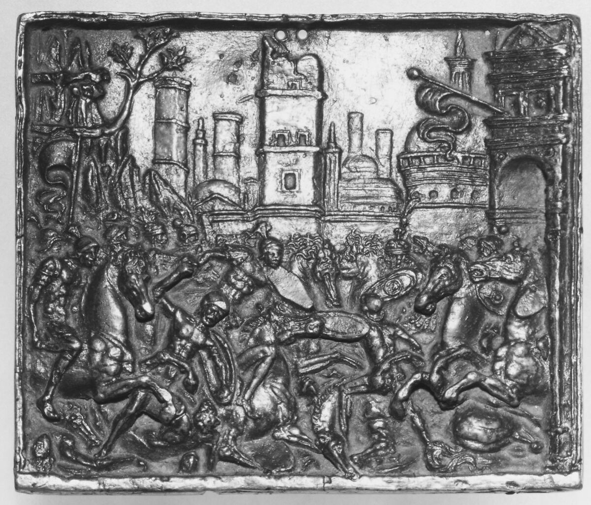 With the Lederer gift in 1986, the Museum received seventy-one plaquettes and related reliefs, among them this scene of foot soldiers and horsemen. There are three examples of Riccio's sarcophagus-inspired battle scene (one is in the Ca' d'Oro, Venice; the other in the National Gallery, Washington, D.C.), each with varying signatures on their backs. Our reverse bears a raised long-tailed R and two spirited incised profiles.