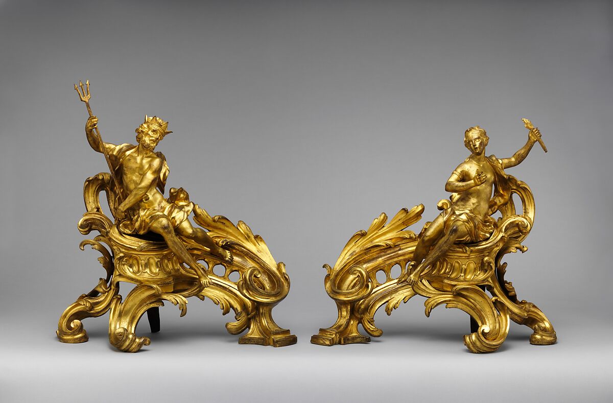 Multiple examples of this model of firedogs, incorporating the figures of two mythological deities in their design, are known. The crowned male figure could be Pluto, Roman god of the underworld; the female pendant might be his love, Proserpina, traditionally shown with a torch, as the woman is here. In fact, in 1753 the metalworker Antoine Lelièvre supplied a pair of chenets decorated with the rulers of the underworld, albeit of a different model, to Louis XV for use at Versailles. However, Pluto is generally rendered with a scepter, not with a trident as here, the latter usually being an attribute of Neptune. Given the fact that andirons were placed in front of the fireplace to reflect the flames, the choice of Neptune and his spouse, Amphitrite, god and goddess of the sea, would have been an amusing one. Whatever their identities might be, these firedogs with their figures perched on pierced scrolling bases evolving into acanthus leaves are a perfect embodiment of the whimsical Rococo taste.