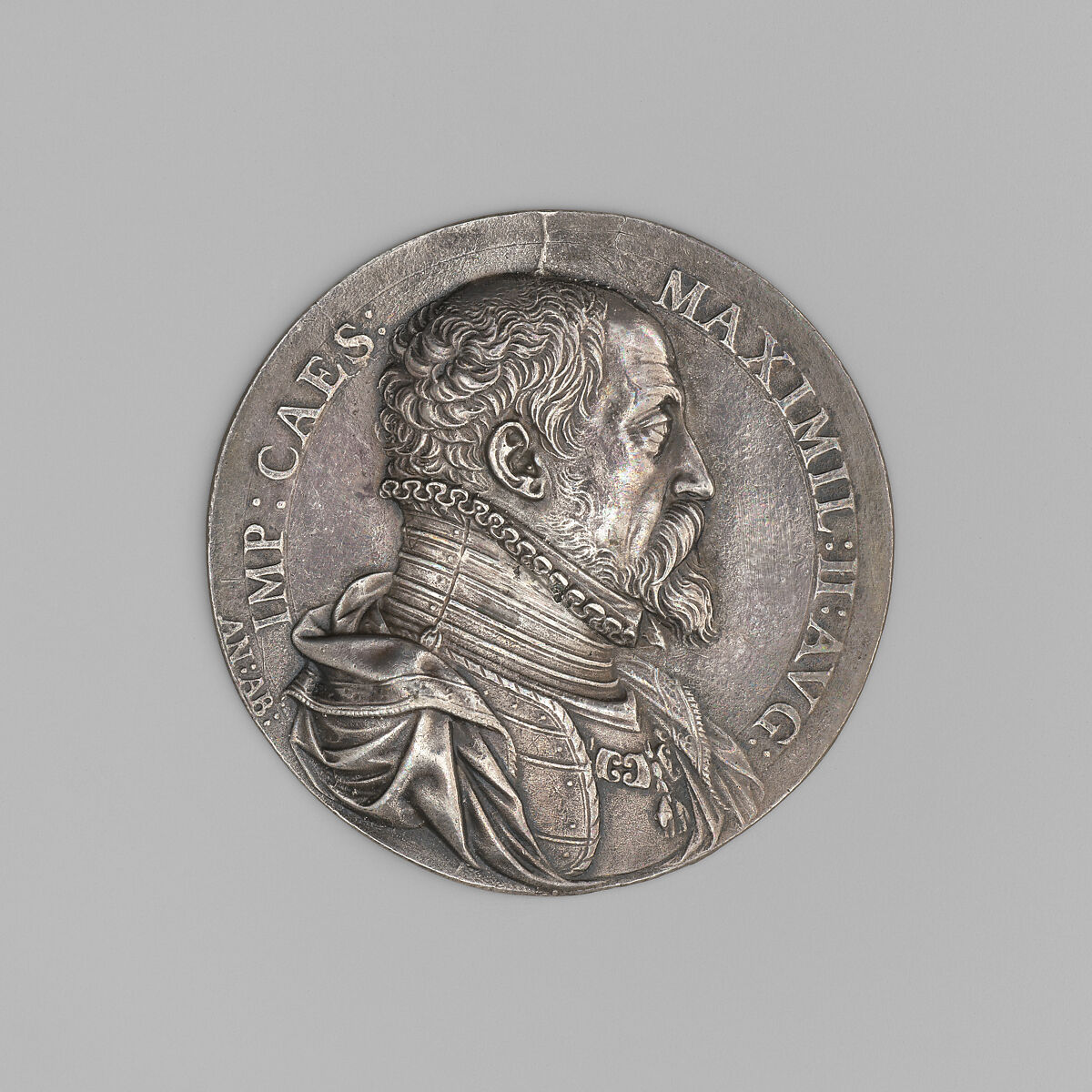 These medal portrayals of the Holy Roman Emperor and his wife Maria (see also 1989.12.3) are cast separate with plain reverse, but the couple can be found united on one medal as well. The separation of the images allowed to compare both captivating profiles as companion pieces side by side, but also enabled craftsmen to incorporate them in other Kunstkammer and presentation objects, such as ebony cabinets or boxes, silver drinking vessels, or precious jewelry mounts. Abondio entered the service of Emperor Maximillian II (r. 1564–76) in Vienna in 1566 and was kept on by his son Rudolf II (r. 1576–1612). The artist later moved with the imperial court from Vienna to Prague. His strength was in the imposing characterization of princely portraiture in which he never neglected his love for minute ornamental details.