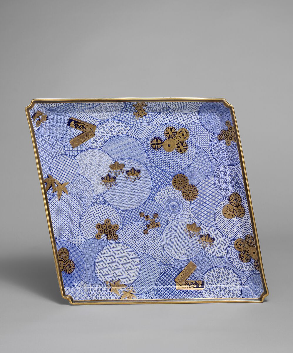 The lozenge-shaped tray is transfer-printed in underglaze blue with a complex design of circles filled with different ground patterns, as though numerous decorated disks had been spread out over the tray, overlapping and overlapped by their neighbors. Over all are clumps of stenciled motifs in gold, consisting of decorated circles, squares, hexagons, plants, flowers, pen boxes, and leaves. The mark S.Y. in gold on the underside of the tray is that of an anonymous gilder. Other marks are a printed Royal Worcester Company mark, a v for the year I884, and the Company's impressed mark, also crowned.
