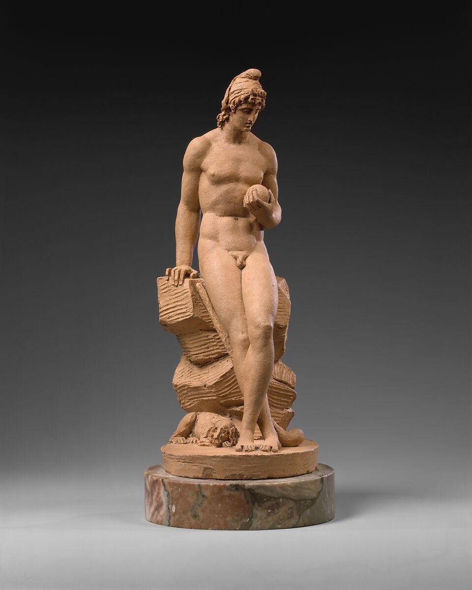 The composition, in particular the crossed ankles, derives from ancient Lansdowne Paris type statue, known from Roman copies after mid-fourth-century Greek original, which Dumont would have seen in Rome and Naples during 1788–93. The pose of Dumont's version, however, is much more supple than that of its antique prototype. It was possibly intended as a sketch model for a silversmith.