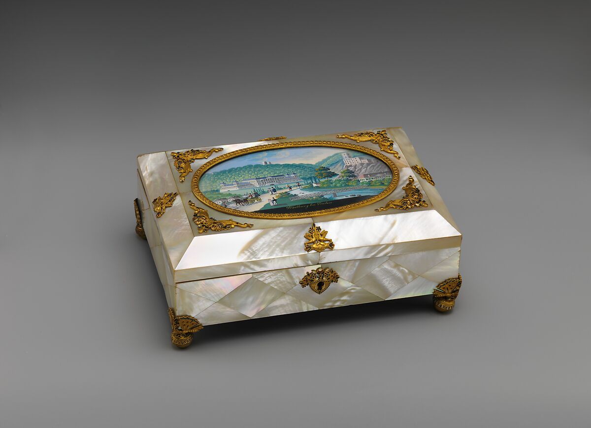 The mother-of-pearl industry in Vienna reached its apogee during the 1820s and 1830s, when numerous luxury items such as candle screens and desk sets were embellished with the iridescent material. Balthasar Wigand, responsible for the miniature on the lid of this box, specialized in views of the city and its surroundings, painted especially for use on small pieces of furniture and caskets.