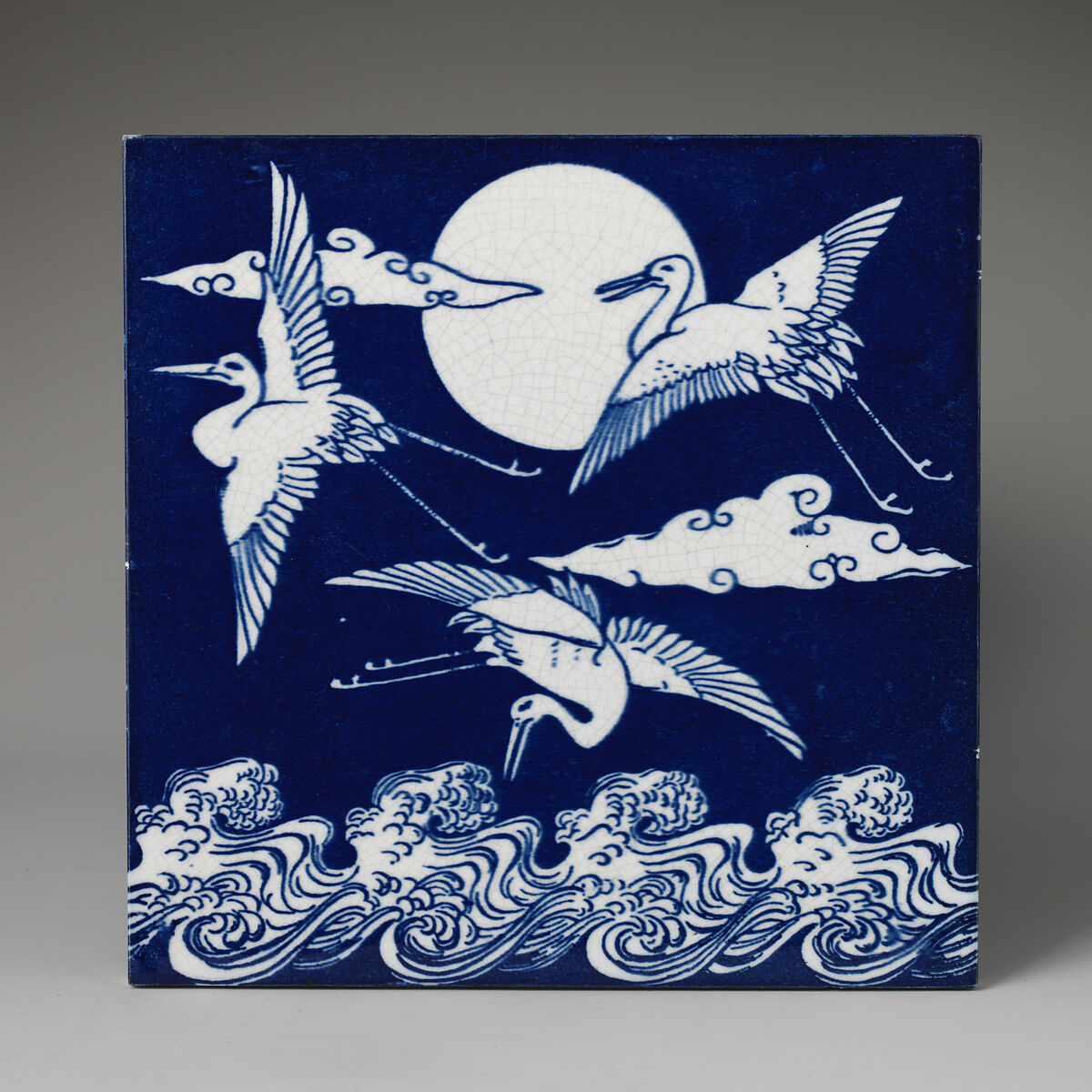 This tile depicts flying cranes, the Japanese symbol for longevity, above stylized waves in white on a deep blue ground. Dresser clearly looked to Japanese sources for inspiration and artistic guidance. The composition of the tile relates directly to a Japanese blue and white ceramic flowerpot, circa 1860, that was exhibited at the 1862 International Exhibition in London and later acquired by the South Kensington Museum (now Victoria and Albert Museum).