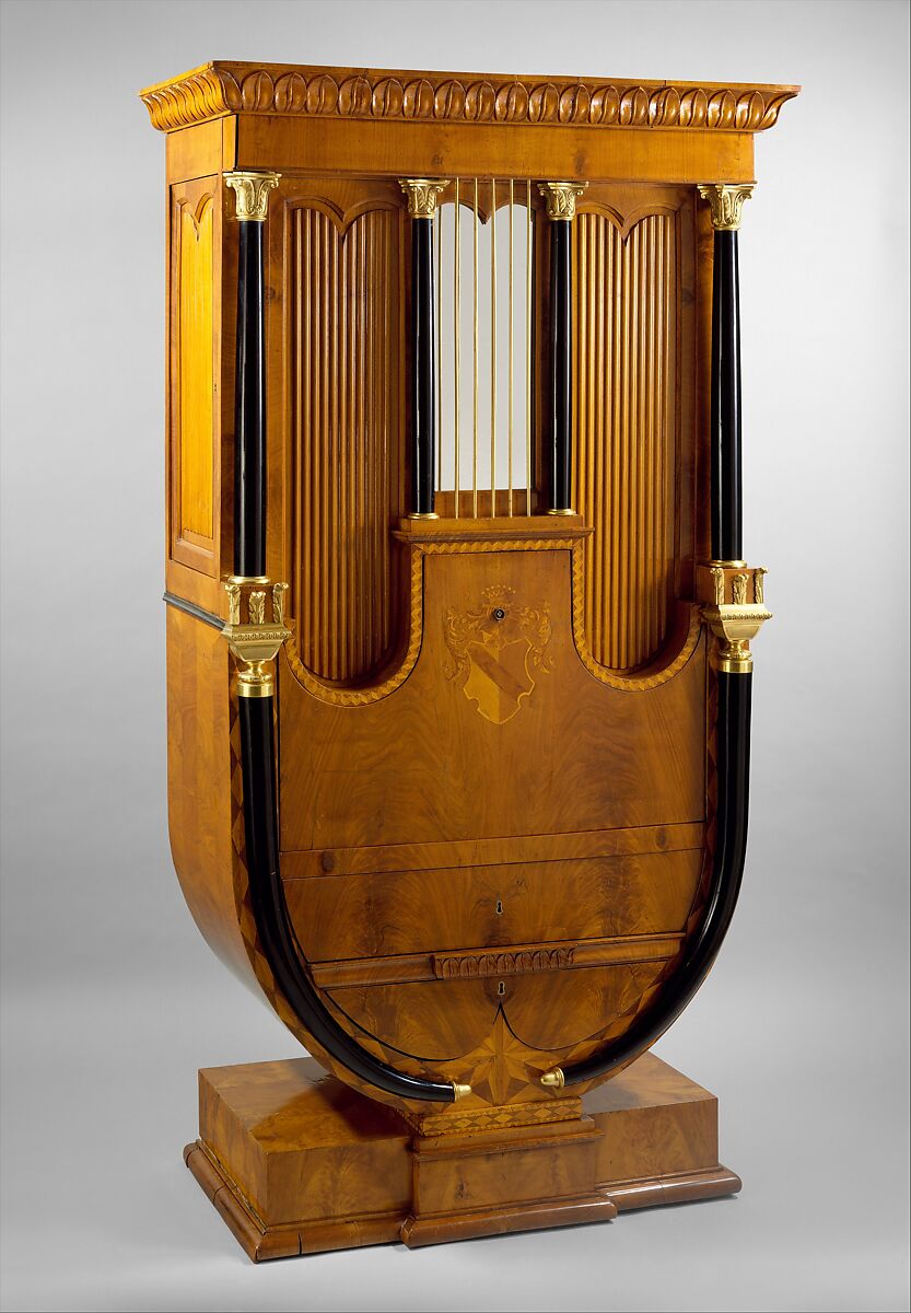 The unidentified coat of arms of this Biedermeier secrétaire, with its wooden columns and slats resembling the pipes of an organ, is a later embellishment.