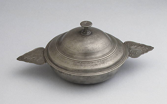 This écuelle strongly resembles in form silver examples in The Met’s collection, such as 48.187.11a, b and 48.187.6a, b. Although of a modest material, this bowl is nevertheless decorated with sophisticated Bérain-esque chasing on the cover and handles. Unmarked, the style would indicate a date after the first quarter of the 18th century.