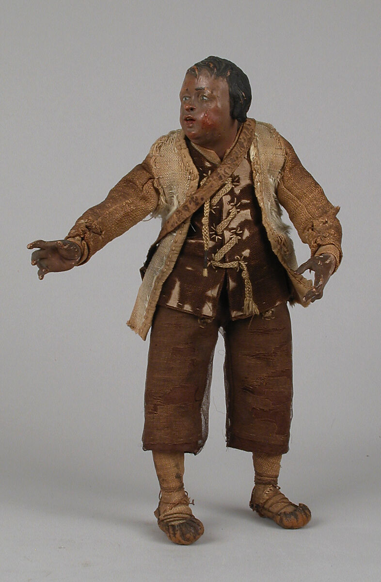 - Medium: Polychromed terracotta head and limbs; body of wire wrapped in tow; linen and cloth garments; leather bag