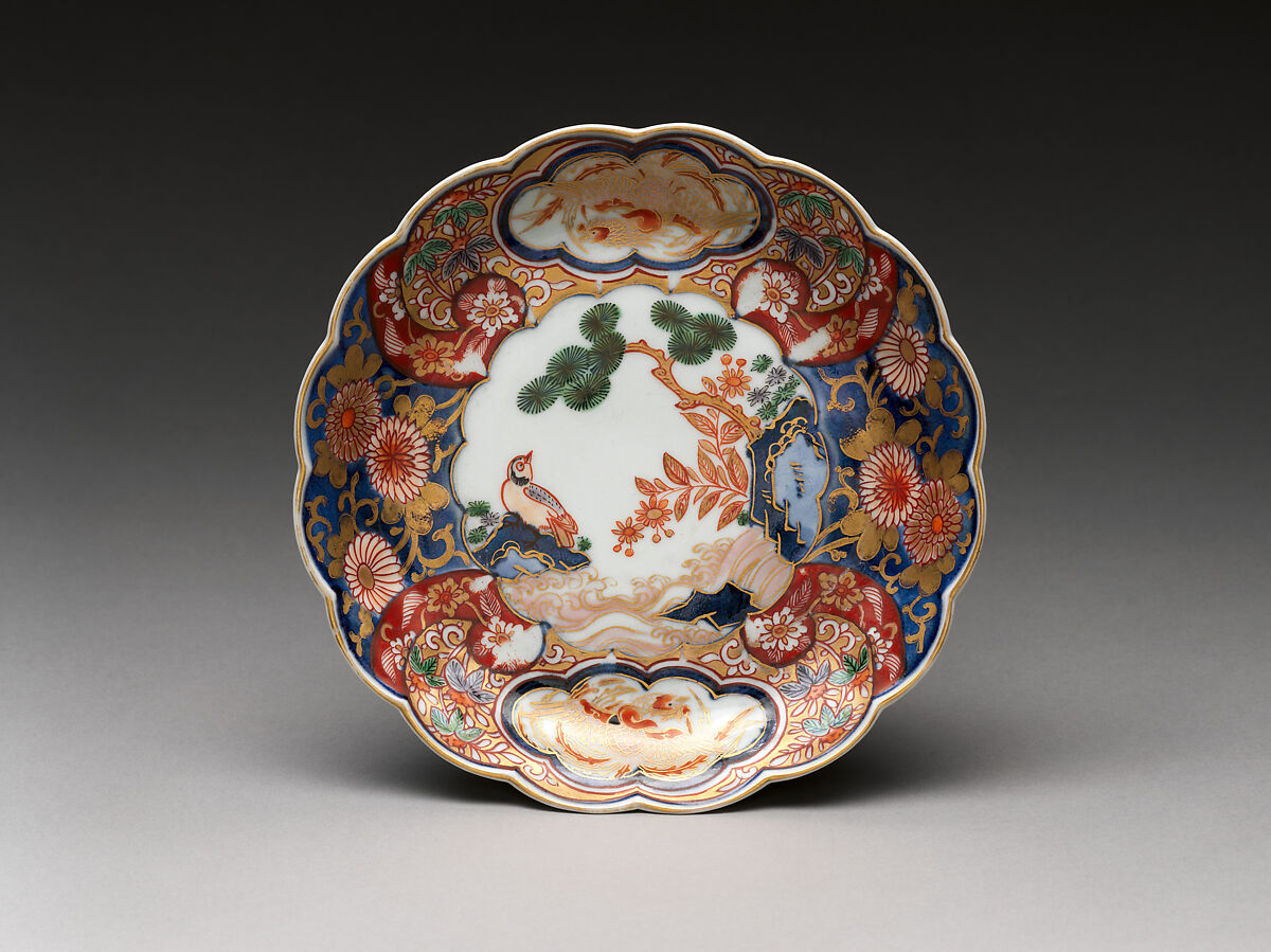 The dense Imari-style patterns on this dish embed numerous reworkings of traditional bird-and-flower motifs drawn from Asian textile and painting traditions. These frame a more conventional arrangement of bird, rock, and tree at water's edge that is Chinese inspired.