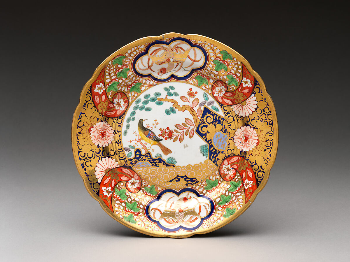 Either a Japanese Imari plate or a mid-eighteenth century Meissen copy of a Japanese original might have served as the design source for this English version.