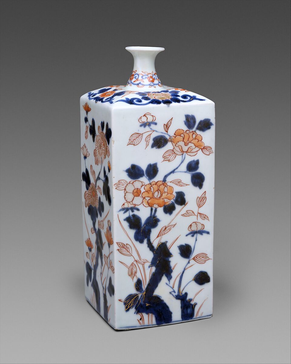 Although the square shape of the bottle replicates a Dutch glass vessel used for holding wine or spirits, the decoration of the flowers of the four seasons—including chrysanthemums symbolic of spring, and peonies for summer—is based on Chinese and Japanese traditions.