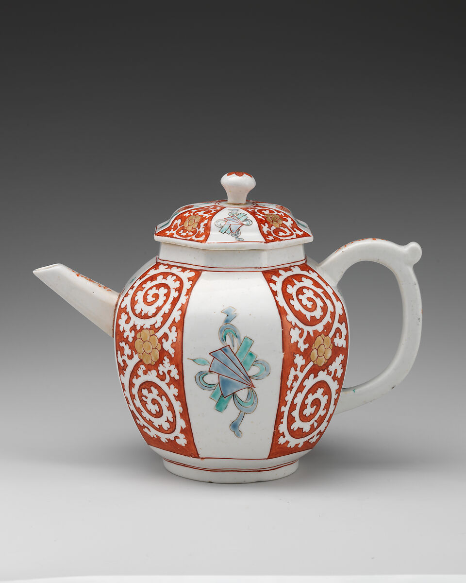 This Chelsea teapot is decorated in the style of Japanese Kakiemon porcelain, in which red often dominated the palette of enamel colors. Kakiemon was widely imitated in Europe, notably by the Meissen factory in Germany, Chantilly in France, and Chelsea in England. While the British versions of Kakiemon were once thought to be based on German adaptations, it now appears that some examples were copied directly from Japanese originals.