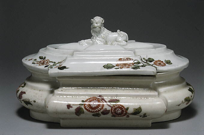 Some wares made early in Du Paquier’s history reveal that the manufactory struggled to perfect firing and decoration. This sugar box has many firing flaws, including a warped lid and grit in the glaze; its decoration is also tentative, painted in the limited early palette. The casket form, which was produced in several sizes, was likely inspired by a silver model. The recumbent lion with a ragged mane is one of two lion-shaped finials made at Du Paquier.