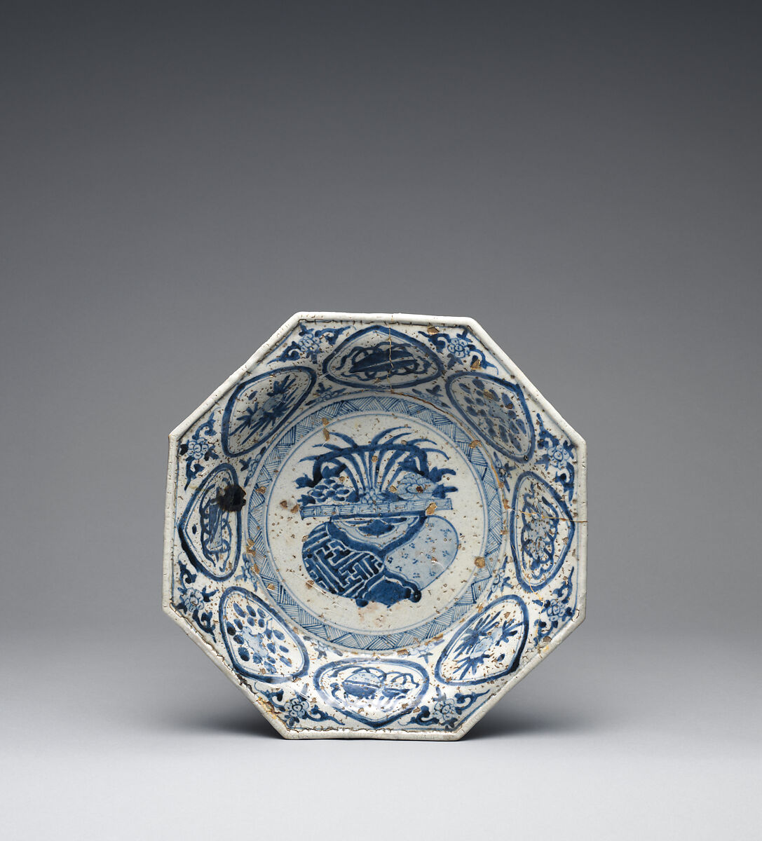 This dish reflects the decorative language of Chinese porcelains of the sixteenth and seventeenth centuries, although the poor quality of its manufacture indicates that it was not made in China, which excelled in the production of all types of ceramics. The blue and white palette established by the Chinese became the global symbol of porcelain, and the motifs painted on this dish are derived from Chinese examples.