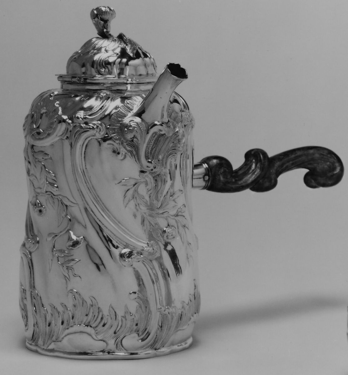 This coffeepot and its mate (1997.412.2) bear the maker's mark EGB, which recent research identifies as belonging to the goldsmith Ernst Gottlob Borns of Bautzen, a city east of Dresden in Saxony. For both pots Borns took the standard eighteenth-century waisted-barrel body form and enlivened it with a playful variety of surface modeling that emphasizes both the malleability and light-reflective qualities of the silver. The superb technique and the flamboyance of the design make these pieces exemplary documents of the distinctive Saxon interpretation of German Rococo. Remarkable details are the rocailles of flamelike appearance surrounding the base, thus teasingly evoking the flames of a burner, and the carved wooden handles echoing the embossed elongated C-scrolls of the silver bodies. Also characteristic is the tension between polished plain surface areas and articulating rocaille and floral relief elements. This style was developed and dominated by Dresden court craftsmen under the patronage of Friedrich August II, elector of Saxony and king of Poland (1696–1763), and his influential prime minister, Count Brühl. Related forms were also employed in products of the nearby Meissen porcelain factory.