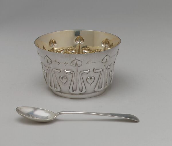 The design is influenced by Art Nouveau, featuring a languid curvaceousness of the ornament and a naive quality with its repeating flowers between single unattached hearts. This shows a strong admixture of the Arts and Crafts movement. The bowl is inscribed "From Her Majesty Queen Alexandra to Mrs. M. F. Ronalds 1907," probably a christening or Christmas present from the queen to Mrs. Ronald for her daughter Thora. The spoon is engraved in the bowl, "From Queen Alexandra."