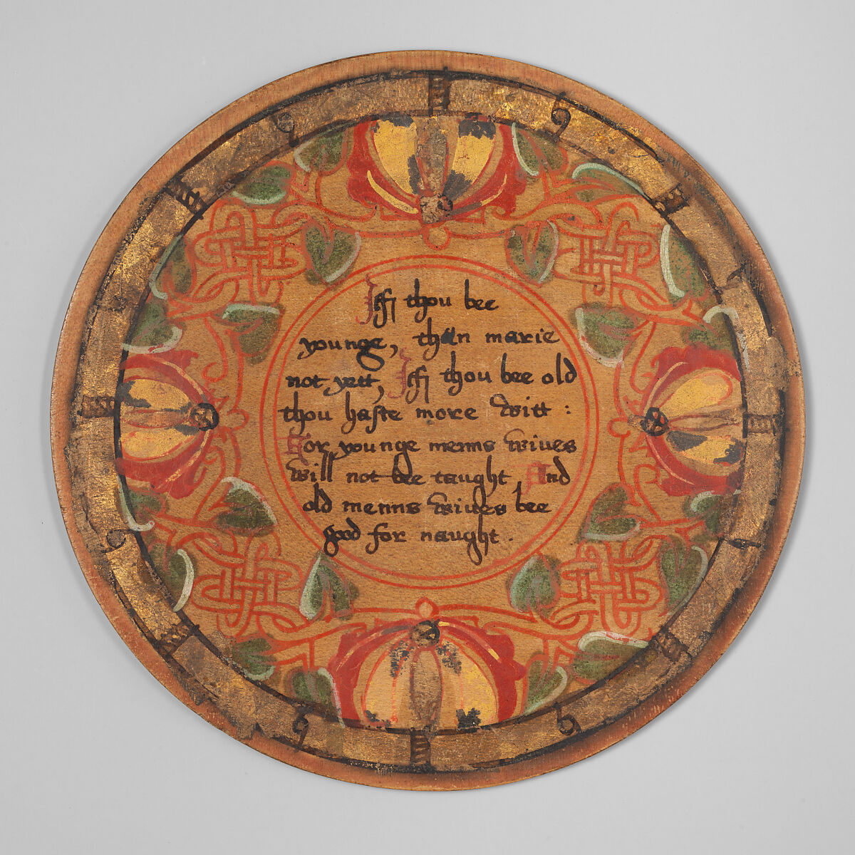 Banquets usually ended with candied fruits or other sweetmeats served on such decorative "spice dishes" of silver or wood. The gold effects were achieved with yellow varnish over a layer of silver-leaf. The verses were written in Black Letter script, with elaborate capital letters in Lombardic script. The verses, either amusing or moralizing, were shared with the other diners.