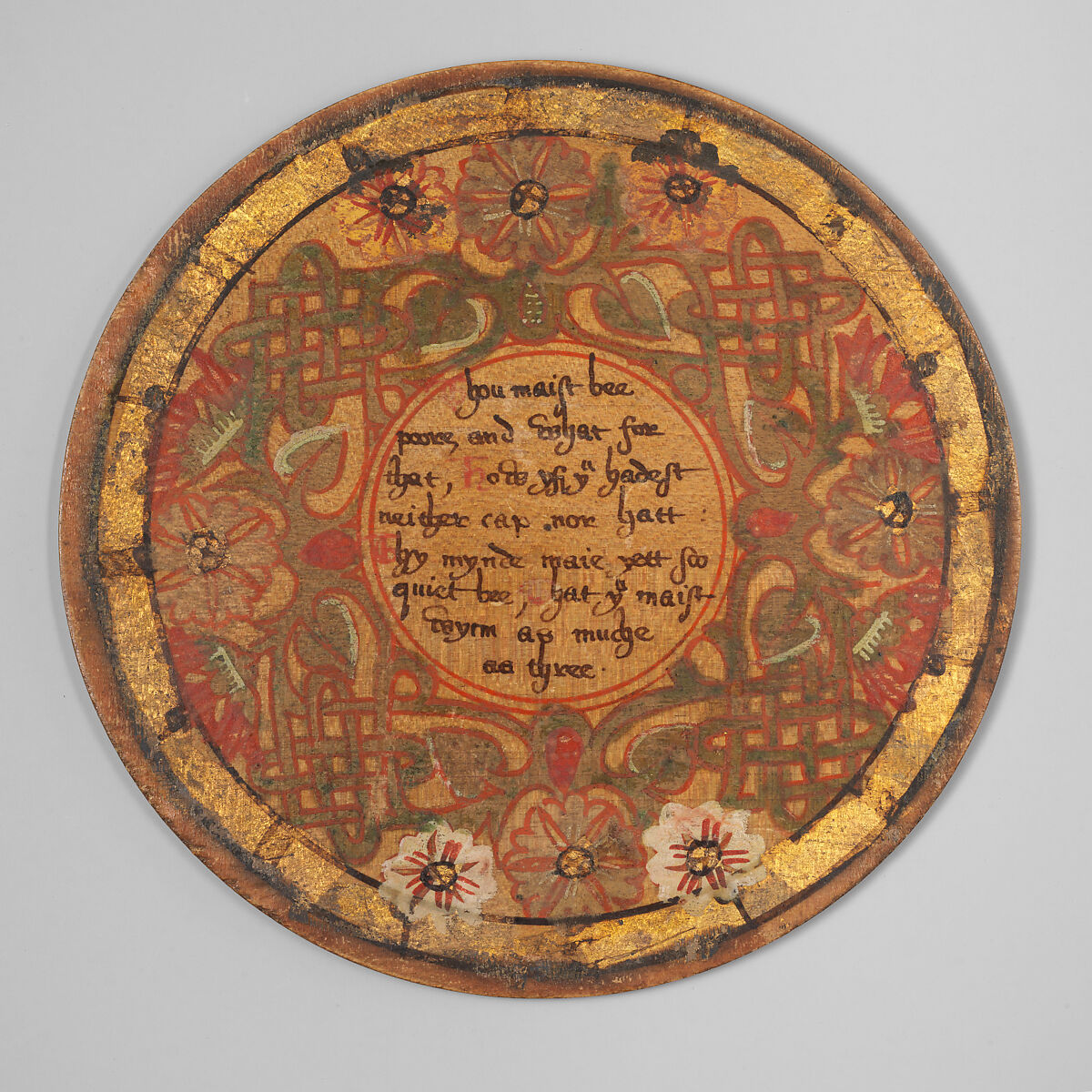 Banquets usually ended with candied fruits or other sweetmeats served on such decorative "spice dishes" of silver or wood. The gold effects were achieved with yellow varnish over a layer of silver-leaf. The verses were written in Black Letter script, with elaborate capital letters in Lombardic script. The verses, either amusing or moralizing, were shared with the other diners.
