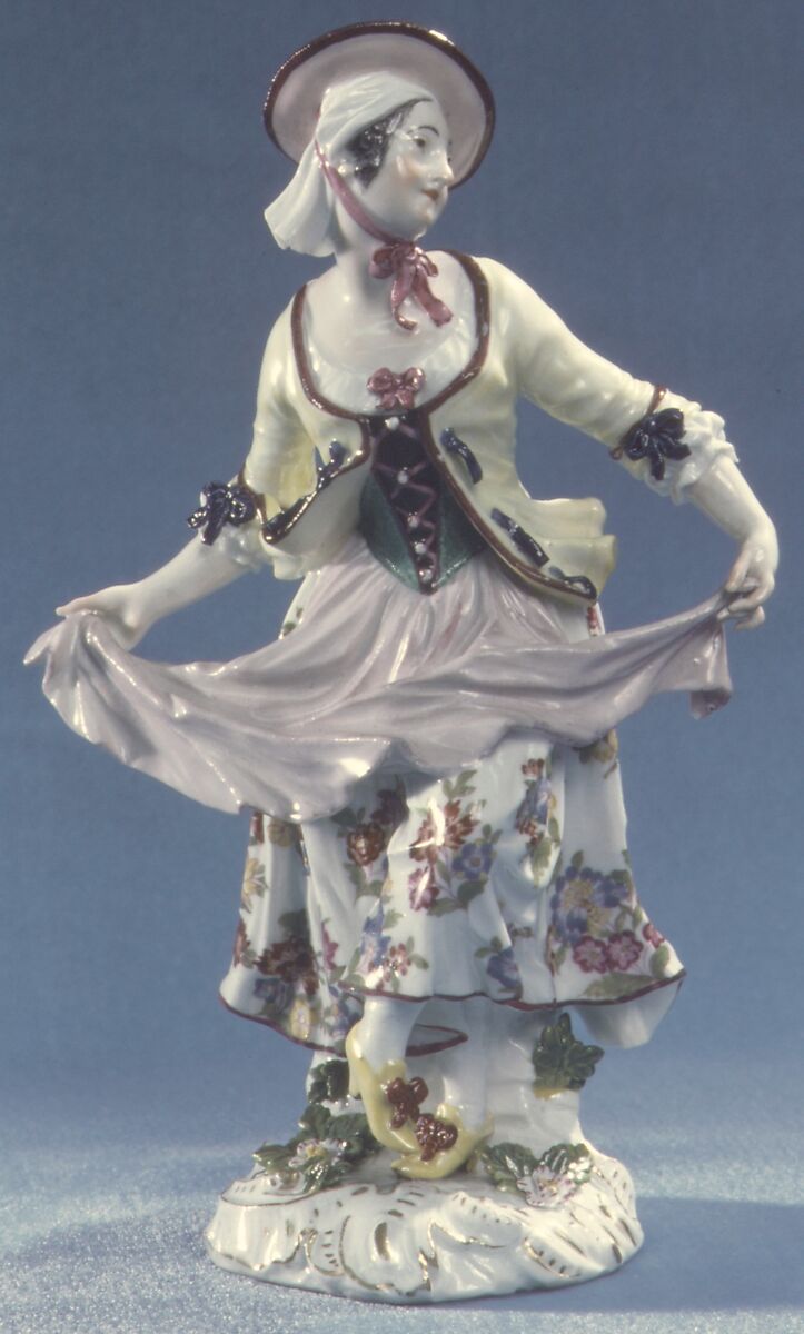 The Meissen figure by Kändler (1974.232.1) served as a model for that made in the Ginori factory (1974.28.116). It is fascinating to observe some of the differences that exist between the German hard-paste figure with its admirable sharpness of modeling, and the Italian statuette with colors that sink into the soft-paste like footsteps in driven snow. One might also compare the plain base of the earlier model with the ornate rocaille base of the latter.