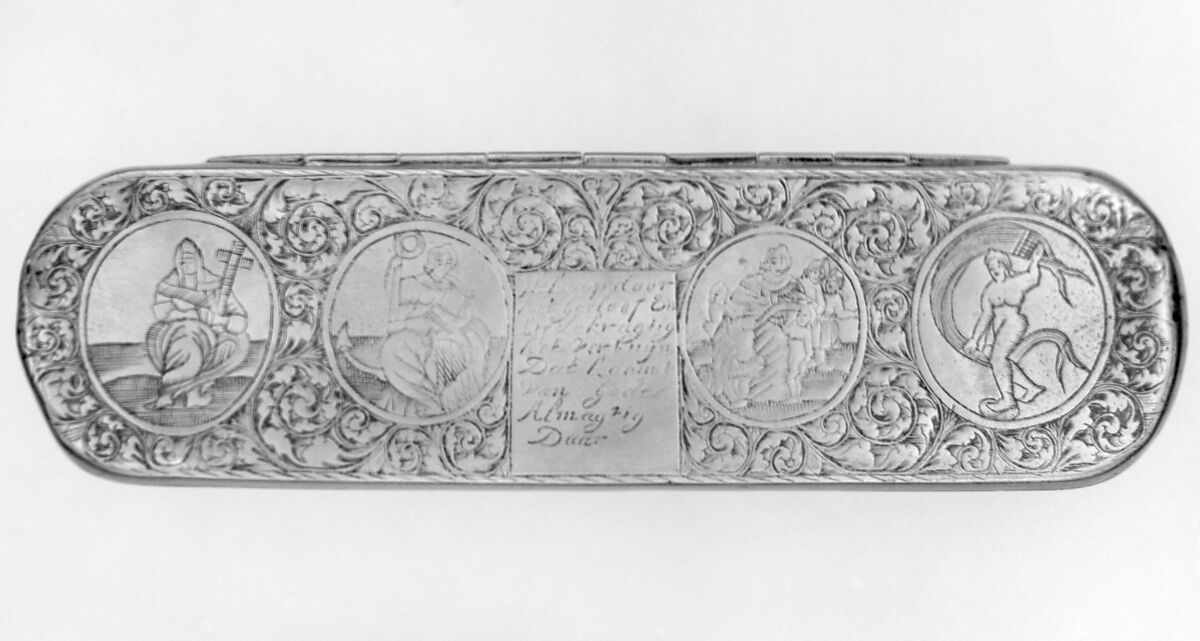 An oblong box with rounded ends. On the lid, surrounded by leaf scrolls, are four medallions depicting, from left to right, three women and a male figure who personify Faith, with a cross; Hope, with an anchor; Charity, surrounded by children; and Fortune with billowing sail. Inscribed in the center is: Ik hoop door het geeloof en lifde kragtig het vertuijn dat koomt van godt almagtig/Daar (I hope [to receive] strengthened through faith and love the fortune that comes from God almighty./ Where ... [the inscription continues on the reverse side]).