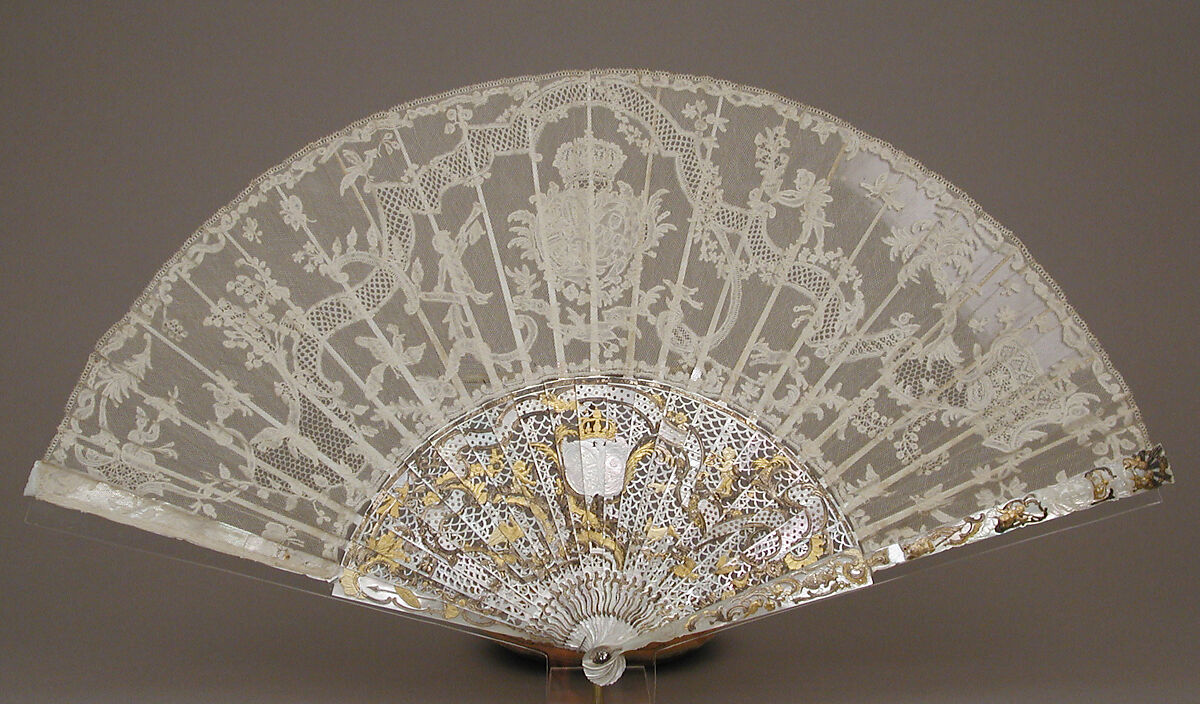 This precious fan and its protective case may have been a gift to King Ferdinand VI of Spain (1713–1759) and his wife, Maria Magdalena Barbara, Infanta of Portugal (1711–1758), whose conjoined coat of arms is worked into the lace and its mount.