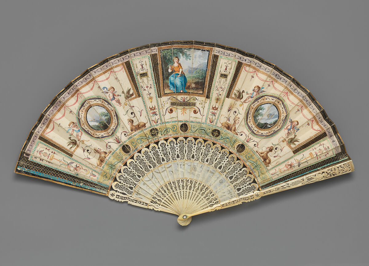The lovely frieze on the front of this fan is delicately hand-painted with antique-inspired grotesques framing landscape cartouches. The reverse of the fan, in contrast, is much more tentative and unsophisticated in its decoration, suggesting that the fan's owner may have customized that side herself.