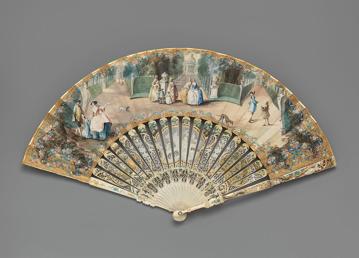 In glorious condition, this fan is a vivid reminder of the expertise reached by British fan-makers only forty-eight years after Queen Anne had awarded her royal charter to incorporate London's Worshipful Company of Fan Makers. The finely carved sticks and guards of ivory are embellished with mica, gilding and paint, but it is the kidskin fan leaf which demands our attention. Figures in contemporary dress explore the gardens of Chiswick House, the highly-fashionable Roman style Palladian villa, completed in 1739, to the designs of Richard Boyle, 3rd Earl of Burlington, with William Kent. In an unusual touch, the fan-painter has included their initials, S.A., as well as the date, 1757, within the painted scene.