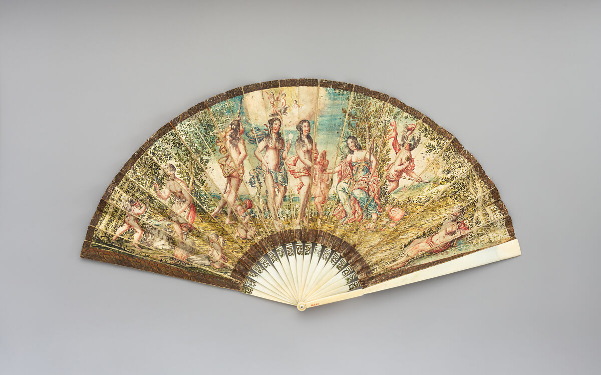 This large fan, a very special and rare survival of late 17th-Century Italian work, is embellished with a colorfully exuberant, hand-painted representation of the Judgement of Paris.