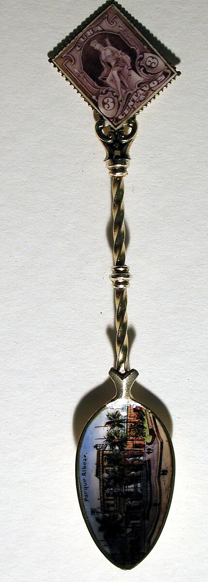 - Title: Souvenir spoon with view of Parque Albear and finial in form of a postage stamp