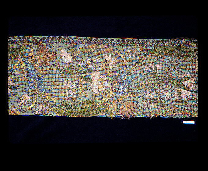 - Medium:Silk and metal thread, embroidered net