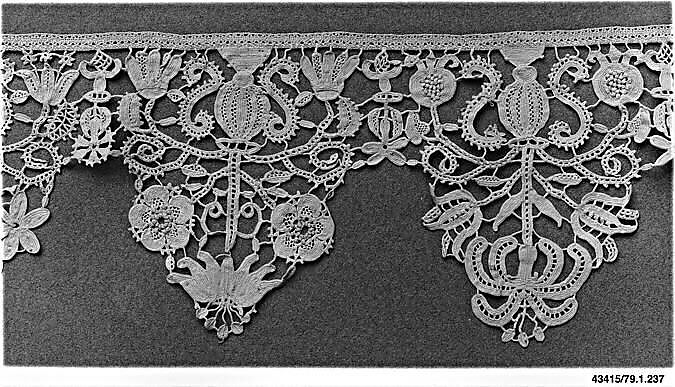 Punto in aria—literally, "stitches in the air"—is one of the earliest styles of needle lace, which is itself developed from cutwork of primarily geometric design. When lacemakers transitioned to using a foundation of threads laid out according to a pattern drawn on parchment, they were able to incorporate more fluid lines and curves into their designs.