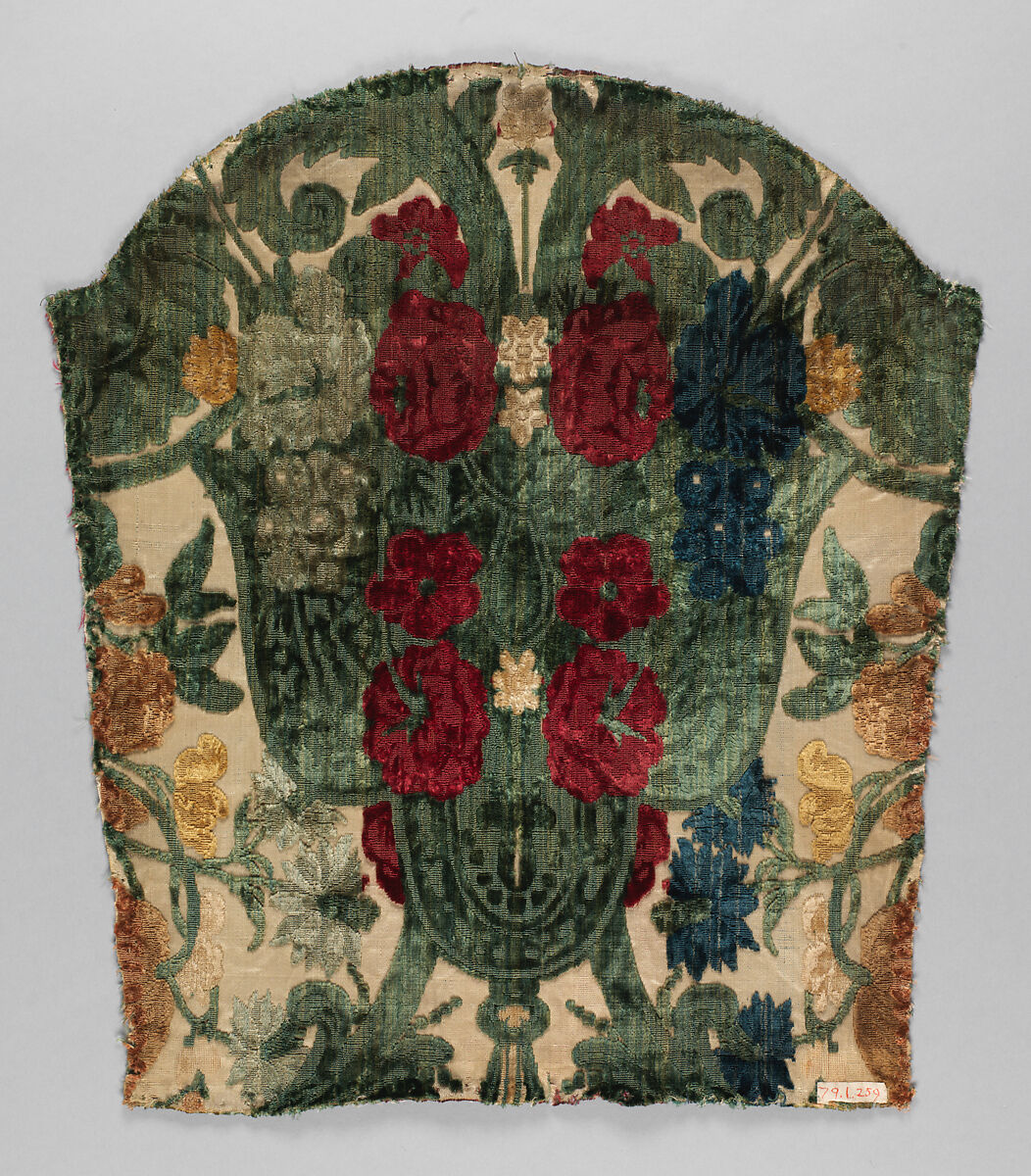 Faced with increasing foreign competition, especially from France, Genoa’s weavers created a niche specialization by weaving silk furniture upholstery. This decorative, polychrome velvet, achieved using multiple differently colored warps, is a fine example. Glorious velvets like this proved exceedingly sought after throughout Europe for embellishing suites of upholstered seating.