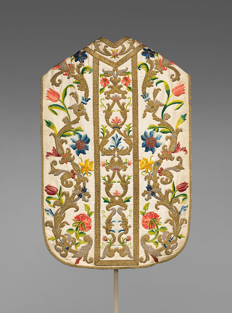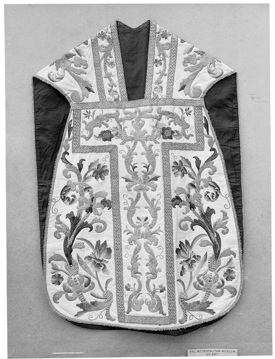This very well-preserved garment synthesizes centuries' old Catholic practice with the machine age. This priest's vestment– a tabard-like chasuble, intended to be worn over the alb and other clothing when conducting church services– is made out of a machine-woven silk; the hand-embroidered floral elements emulate Renaissance designs and continue a long tradition of well-executed Italian needlework, also making copious use of shiny metal-thread.
