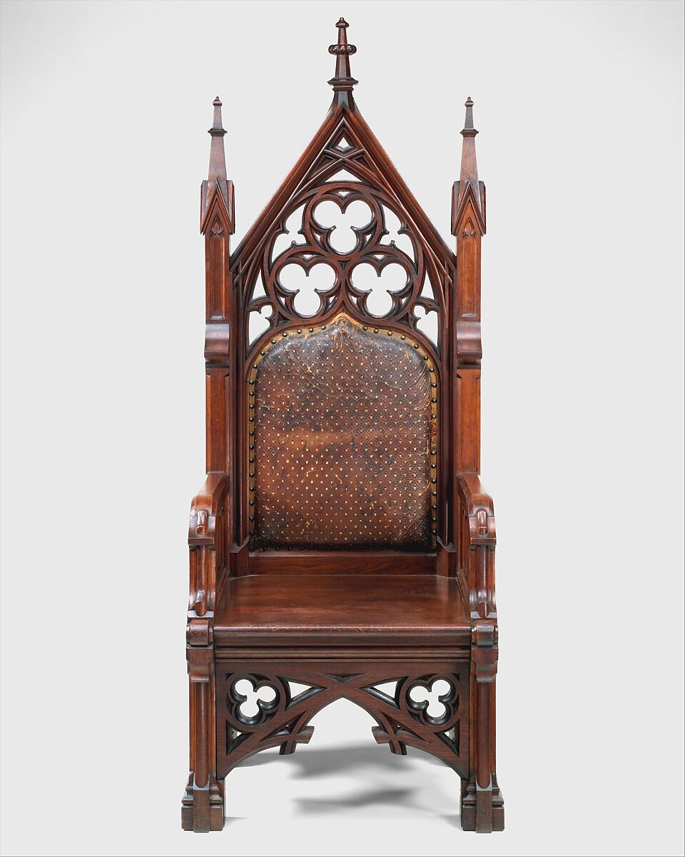 This stately armchair is thought to have come from Belvoir, a Gothic villa built in the 1850s in Yonkers, New York, for the tobacco merchant Christian H. Lilienthal. It likely was used in the library, a room for which the Gothic style was favored. A period photograph of the library records furniture identified as the work of Gustave Herter, suggesting the German-born craftsman may have created this chair. The pierced-trefoil back, pointed arches, and crockets borrow directly from Gothic architecture. During this period of profound industrial and cultural change, designers and consumers looked to historical styles such as the Gothic to inform new aesthetic sensibilities.