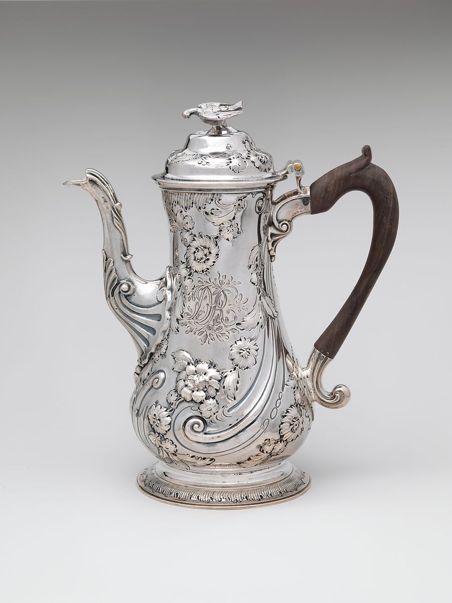 The New York silversmith Myer Myers made the sugar bowl, creampot, and tongs (2012.244.2–.4) to accompany this English coffeepot, echoing its repoussé Rococo ornament of sinuous C-scrolls and floral motifs. All four objects bear the initials of Dorothy Remsen, who married Abraham Brinckerhoff of New York in 1772. Such commissions were an important way for domestic silversmiths to familiarize themselves with the prevailing European styles.