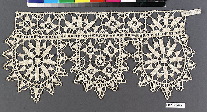 Punto in aria—literally, "stitches in the air"—is one of the earliest styles of needle lace, which is itself developed from cutwork of primarily geometric design. When lacemakers transitioned to using a foundation of threads laid out according to a pattern drawn on parchment, they were able to incorporate more fluid lines and curves into their designs.