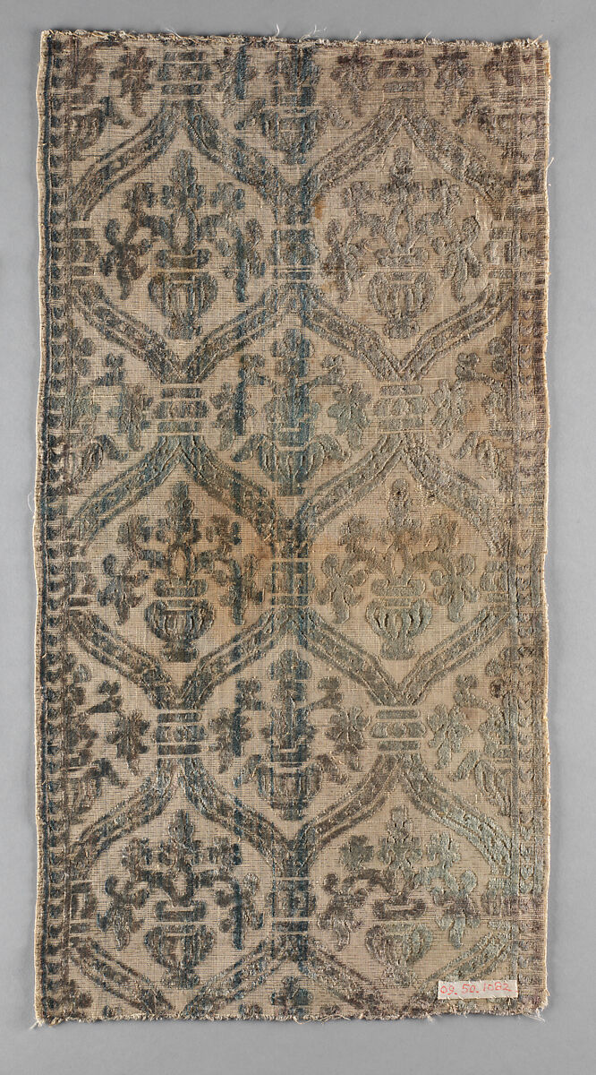 Velvets like this were used for clothing, religious vestments, and altar dressings, as well as for wall coverings and cloths of honor. The thick, light-reflecting, tactile pile, which differentiates velvet from other silks, was achieved during the weaving process by using rods or wires to loop up warp threads rather than pull them tight and flat. This sumptuous example, which incorporates glittering strips of silver lamella running from selvedge to selvedge, is of a type popularly described as “cloth of silver” from the sixteenth century onward.