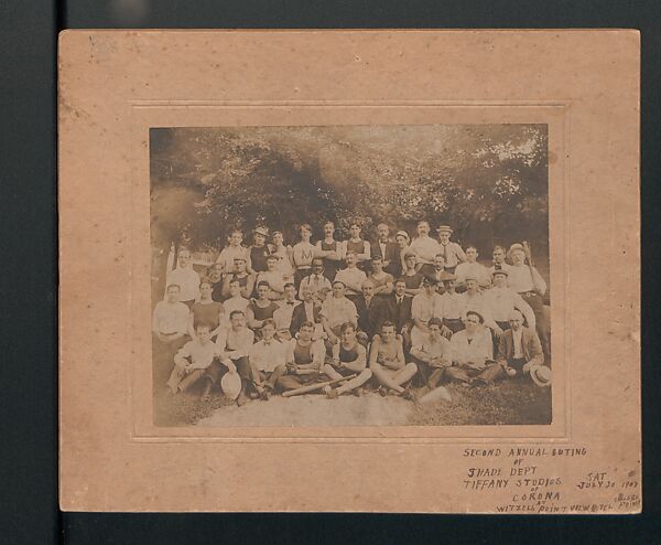 Tiffany Studios (1902-1932) became well-known for its leaded-glass products, including lampshades (see 1974.214.15a,b; 1986.81.1a,b,c; 2011.99.3). During the course of its operation, the lampshade department was one of the most innovative and successful craftsmen's shops in America. To produce these complex objects, a skilled craftsperson would rely on cartoons to cut out brass templates that would then be used as guides to cut the hundreds of individual pieces of glass. The shade would then be assembled on a rounded wooden model or “form” and the glass pieces secured together with soldered lead. The American Wing’s collection includes several objects involved in the fabrication of Tiffany’s glass lampshades such as: a workbench (1980.497.1), a wooden model (1980.497.4), cartoons (1980.497.14), tools for cutting glass (1980.497.2,.3), and foil (1980.497.6,.7), for soldering lead (1980.497.8,.9), as well as photographs of workers in the department (1980.497.23-.25). When the department closed, its head, John Dikeman (1882–1967), retained the equipment for his own use in restoring Tiffany glass and decorative artifacts.