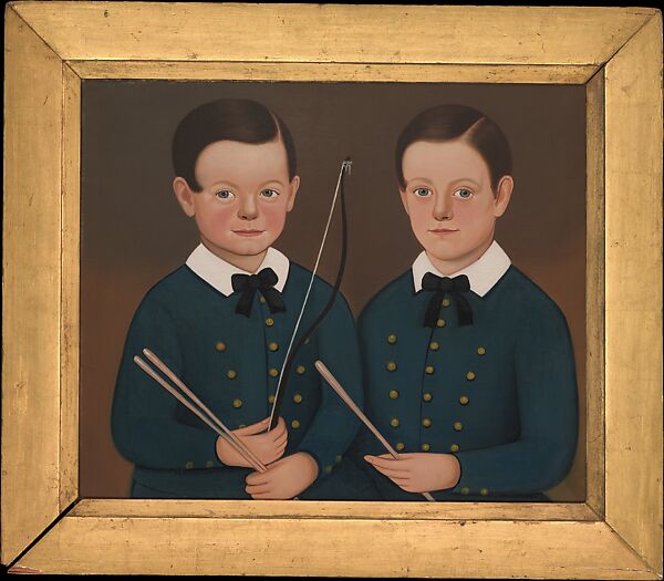 In this double portrait, the twin brothers John and William Dolliver of Gloucester, Massachusetts, are identically attired, wearing royal blue jackets with white collars and black bows at the neck. They are shown holding drum sticks and a toy whip, -- attributes of boyhood, against a plain background. Their facial features, including their outlined eyebrows, blunt-tipped noses, and the t-shaped creases in the corners of their mouths, are characteristics of Kennedy’s style.