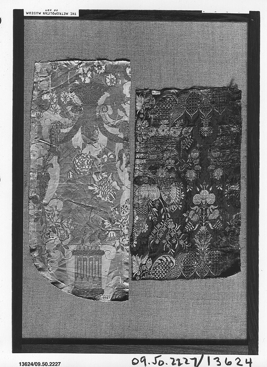Panels such as this—with its extraordinary patterns in long repeats—were called "bizarre" by the Danish scholar Slomann, who believed they were made in India. Most scholars consider them an exotic phase in the history of European silk weaving.