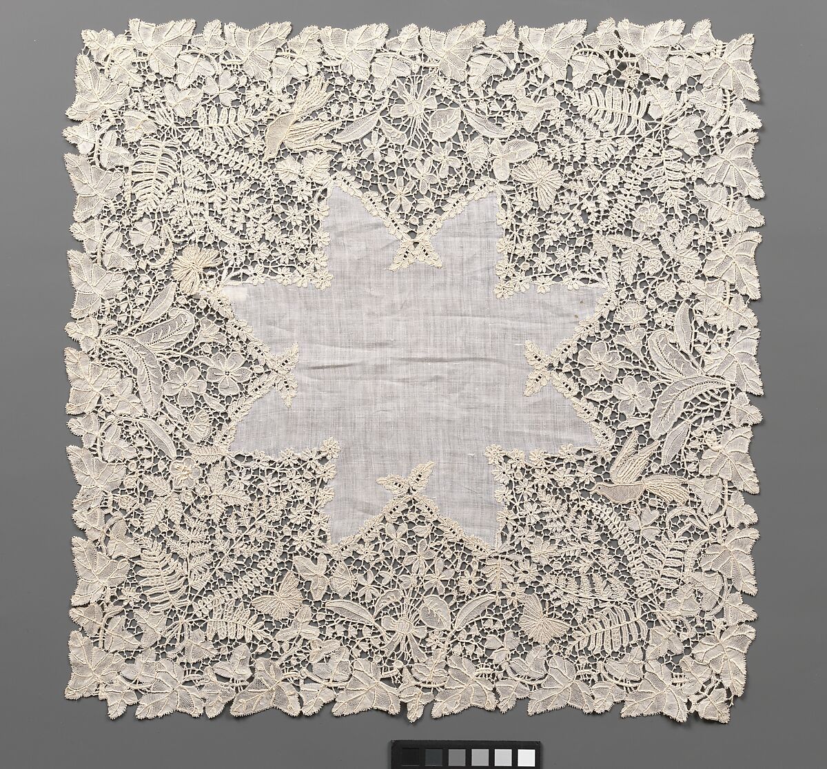 Emma Radford was a prize-winning lacemaker and designer in her native Devon. Devonshire bobbin lace, commonly known as Honiton lace, comprised individual motifs that were later joined together. Queen Victoria chose Honiton lace for her wedding ensemble in 1840, leading to a boom in its popularity in the mid-nineteenth century. Philanthropists of the period were intent on increasing sales of handmade lace to alleviate the poverty of lacemakers. This movement coincided with the development of a new and uniquely English style of lace that incorporated motifs of highly naturalistic flowers, birds, and insects. The techniques developed to craft three-dimensional effects such as those seen in this piece, sometimes called raised work, were a specialty of Honiton lace workers.