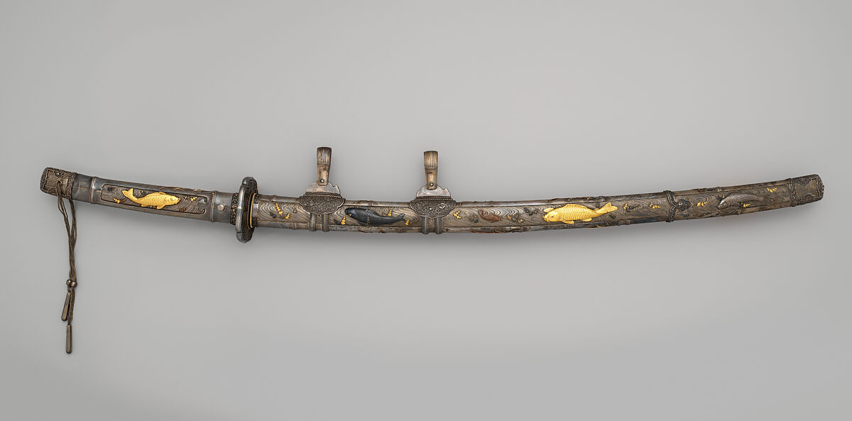 This sword mounting is made of silver decorated in various metals with a design of waves, fish, and aquatic plants. The edge of the hilt and scabbard are wrought with a design that represents bamboo. The maker, Iwamoto Kansai (岩本寛斎, active 19th century), was a student of the eighth and last master of the famous Edo-based Iwamoto School of sword fittings makers.