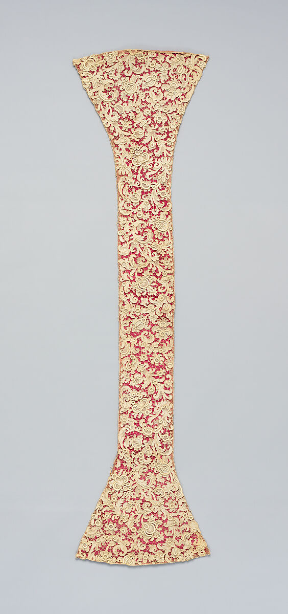 Venetian gros point lace was prized for its refined beauty long after its heyday. This maniple repurposes seventeenth-century needle lace, which has been cut up and reassembled into a new shape. This is part of the set 10.186.1, .2, .3, .5 that comprises a chasuble, maniple, stole, and chalice veil.