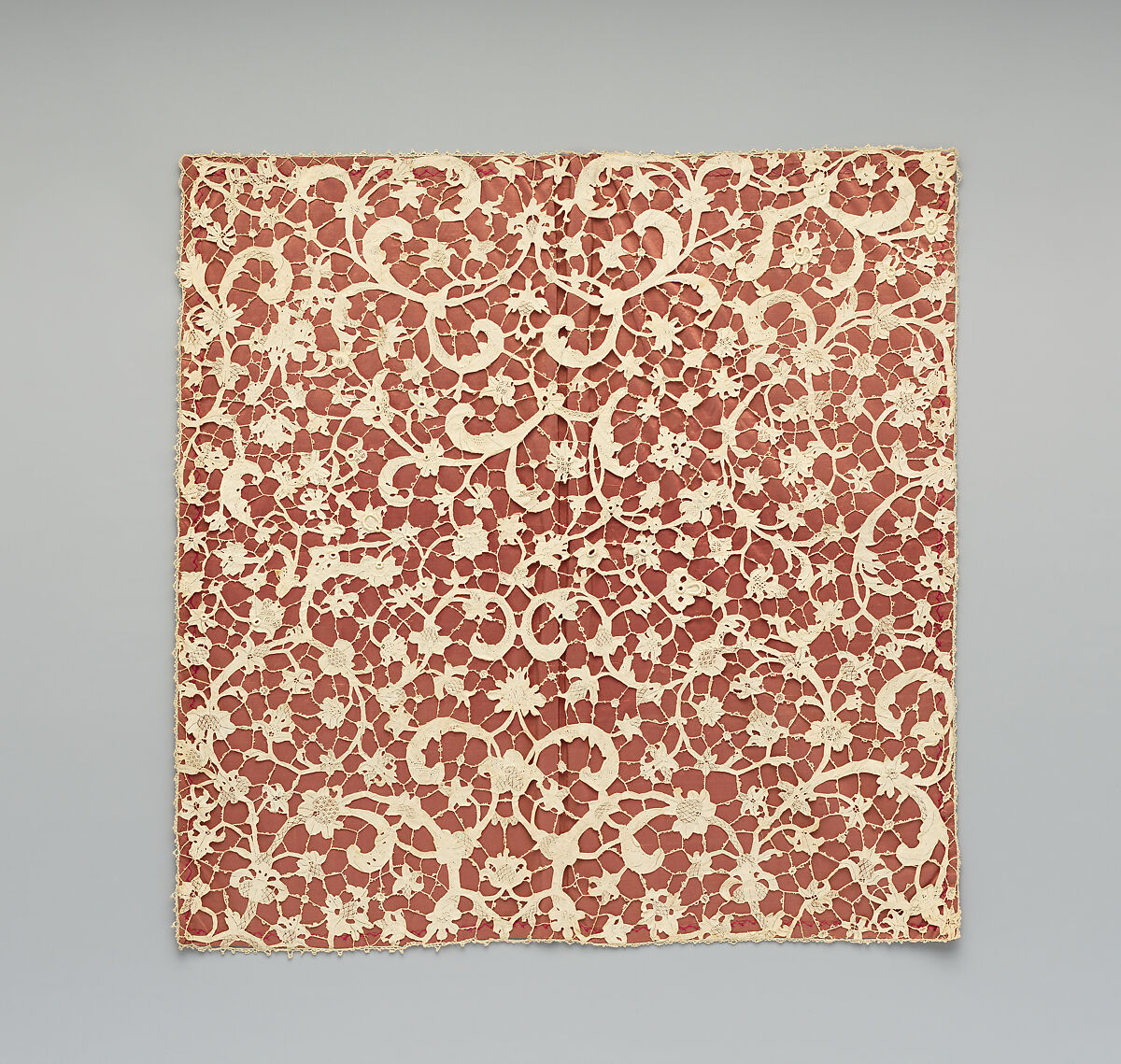 Due to its relatively flat surface, this densely-worked Venetian needle lace is known as point plat. Point plat was believed to have developed as a slightly less time-consuming version of the three-dimensional Venetian needle lace gros point. This particular piece was rearranged into a chalice veil as part of a set of church vestments. This is part of the set 10.186.1, .2, .3, .5 that comprises a chasuble, maniple, stole, and chalice veil.
