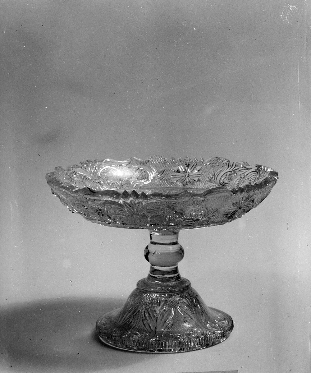 This small compote in the French style is pressed with a daisy pattern on the bowl and acanthus leaf on the foot.