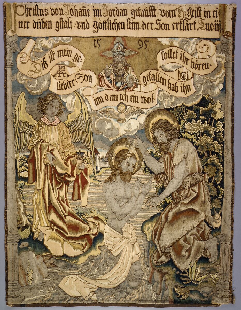 With subtlety and dexterity, this tapestry's weavers- who apparently used the monograms AR and ICM- borrowed, enlarged, reversed, and added color to Martin Schongauer’s design for the Baptism of Christ engraving of circa 1470-74.