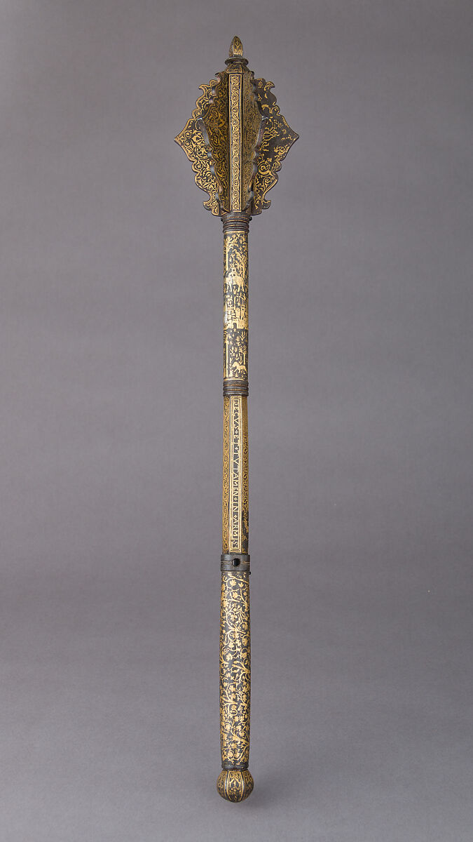 This mace bears the emblems and mottoes of Henry II (reigned 1547–59) and the signature of the Spanish-born swordsmith and damascener Diego de Çaias, who worked for the French court from 1535 to 1542 and then in England at the court of Henry VIII. The mace appears to have been made for Henry between the time he became dauphin (heir apparent) in 1539 and de Çaias's departure for England in 1542. The tiny multifigured battle scenes in gold and silver are characteristic of de Çaias's work.