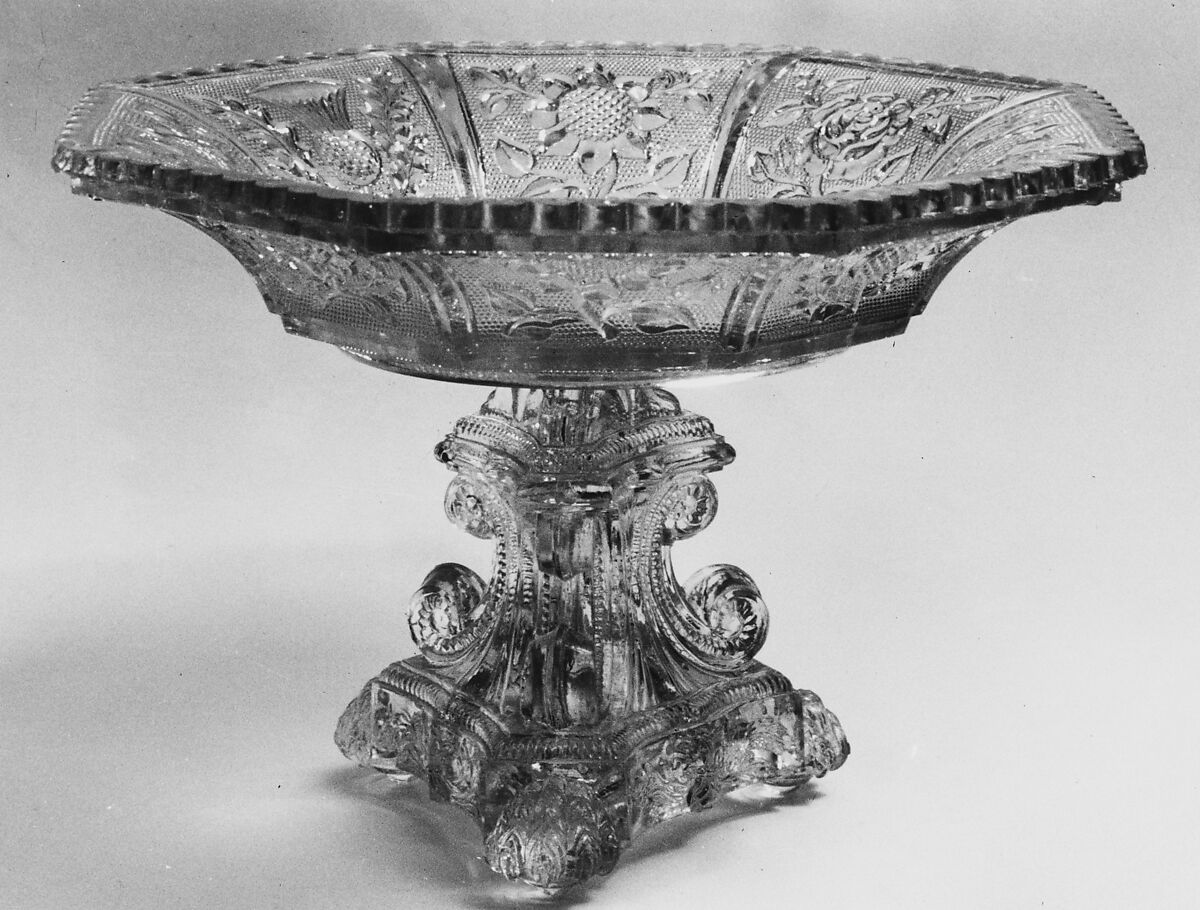 This compote, with its octagonal bowl, scrolled pedestal, triangular base and paw feet, is pressed with rose, thistle and dahlia patterns.
