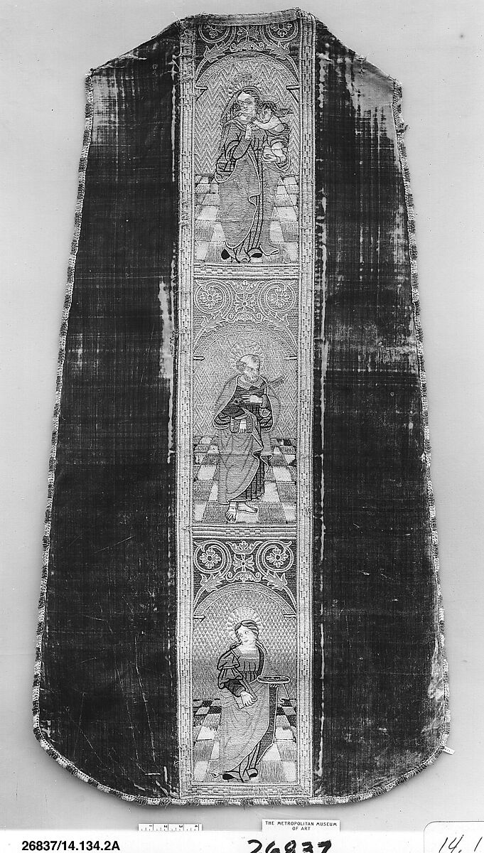 This garment is almost certainly a dealer's composite object, assembled towards the end of the nineteenth century to meet the demands of the lively antiques' market. Though resembling a priestly chasuble, it is unconventionally large and combines a very low quality, thin and relatively modern patched velvet with a much older set of embroideries. The embroideries have been very heavily restored, indeed the saint figures (Saints Paul and Barbara on the front; the Virgin and Child, Saints Peter and Lucy on the reverse) may have been cut out of a historic textile and reapplied onto modern, embroidered niches designed in pastiche Renaissance style.