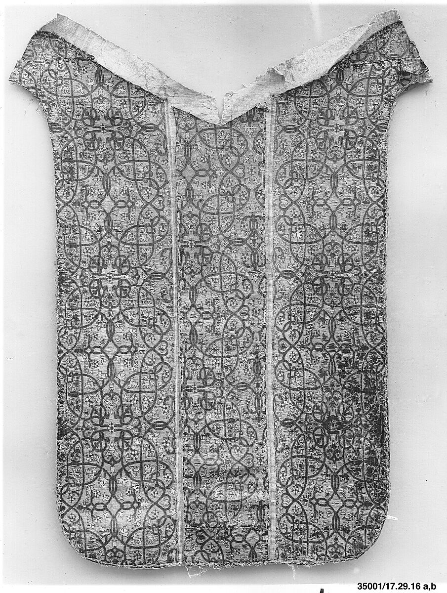 With its ornate and intricate knotwork patterning- still discernable despite the surface losses of the yellow supplementary weft- this textile is an evocative survival of Spanish, sixteenth-century weaving. When these strips were first part of The Met's collection, they were attached to an additional fragment of the same textile (17.29.16b) and assembled to imitate the front of a liturgical garment (as recorded in black-and-white photography). This was probably an early twentieth-century construction created by dealers to make the fragments more saleable.
