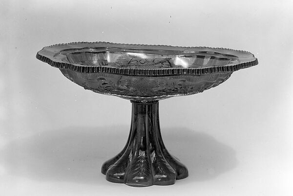 The bowl of this compote is pressed in the "princess feather" medallion pattern alternating with baskets of fruit. The bowl was pressed in the same mold as that used for a vegetable dish in this collection, 51.171.182a, b.